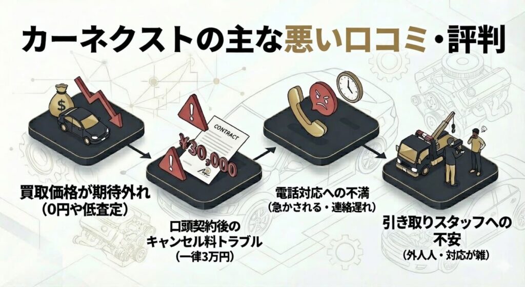 カーネクストの悪い口コミ・評判は主に「買取価格の安さ」「口頭契約とキャンセル料3万円」「電話対応や入金の遅れ」「提携業者への不満」に集中しています。