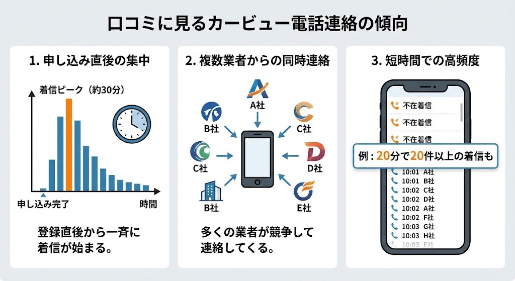 カービューに査定を申し込むと、登録直後から複数の買取業者に連絡先が共有され、各業者が一斉に電話をかけてきます。