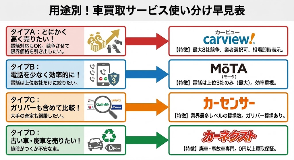 - 【合わない人への代替案】 電話が絶対に嫌ならMOTA・ユーカーパック、ガリバー査定を入れたいならカーセンサーと使い分ければいい