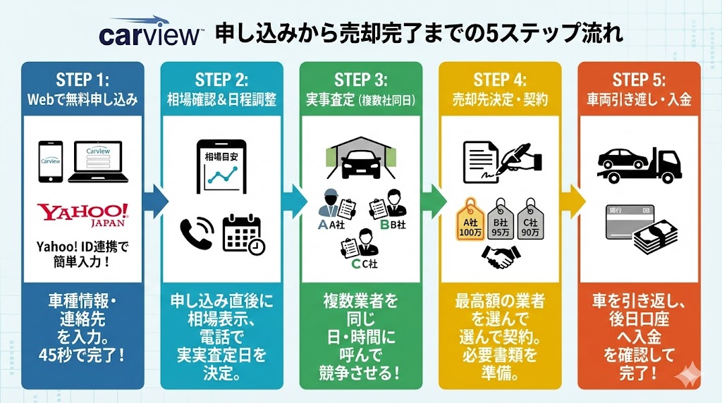 申し込みから入金まで、流れが分かれば怖くありません。カービューへの申し込みは45秒で完了します。まずは相場を確認するだけでも試してみてください。