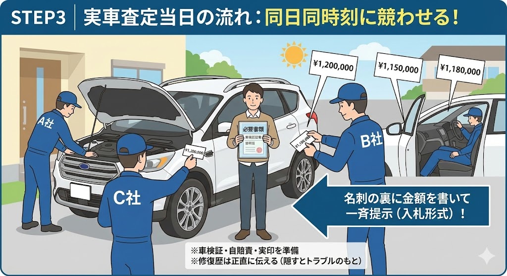 STEP3:実車査定は複数社を同じ日に呼んで競わせる