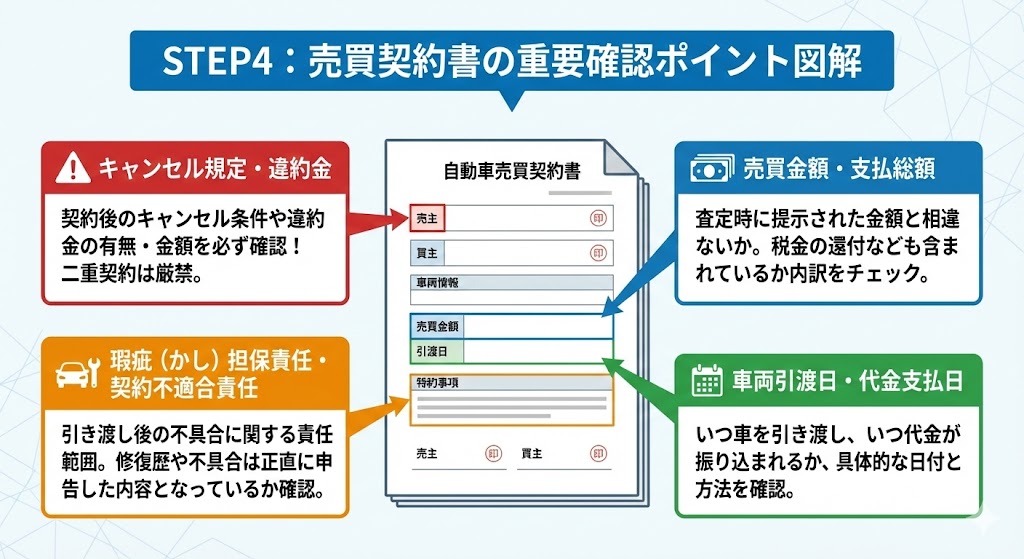 契約書にサインする前に、記載内容を必ず確認してください。特に「査定額」「引き渡し日」「キャンセル条件」の3点は見落とさないようにします。