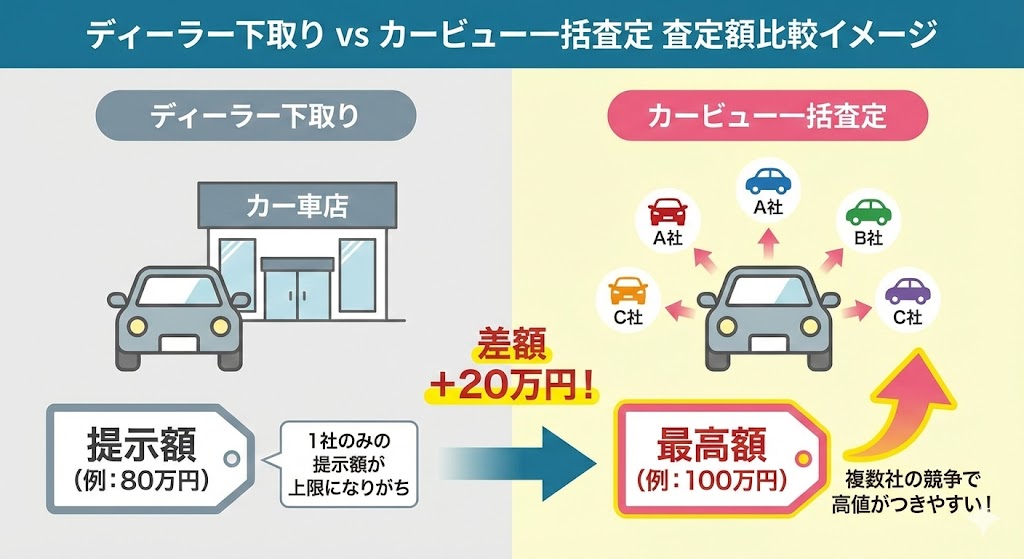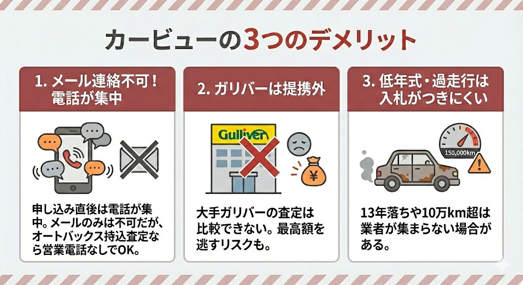 ただし、これはカービュー単体の問題ではなく一括査定サービス全般に共通する構造的な特性。