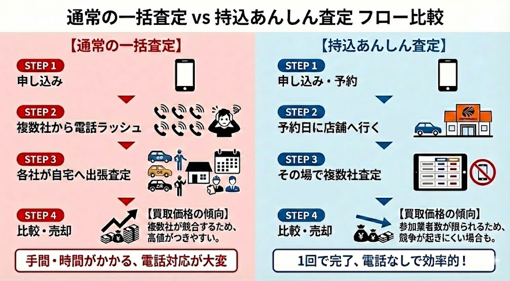 流れを事前に把握しておくと、電話への対応や査定当日の段取りがスムーズになり、高く売るための判断もしやすくなります。