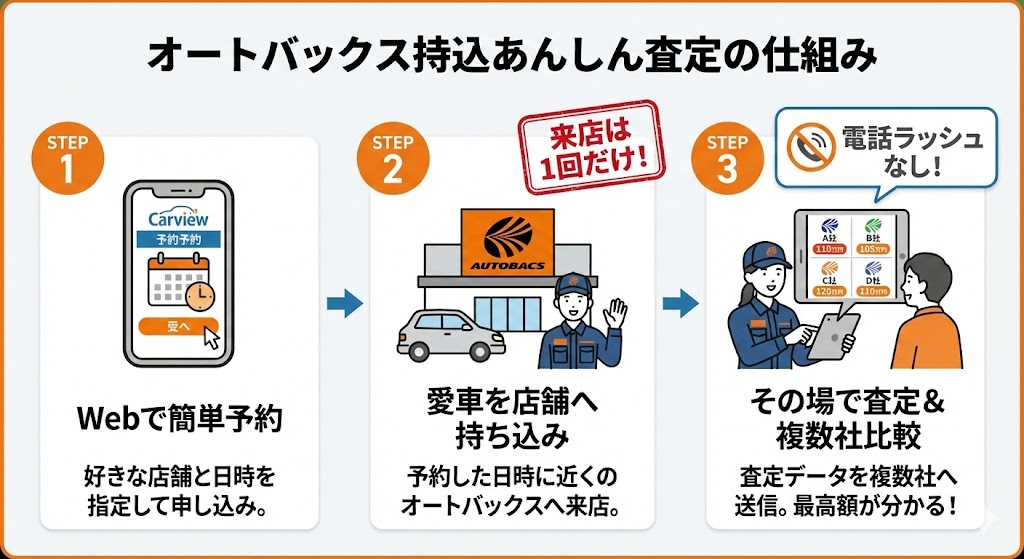 - 【電話ゼロの選択肢】 オートバックス持込あんしん査定なら業者からの電話なしで複数社比較が完結。カービューだけが持つ独自オプション