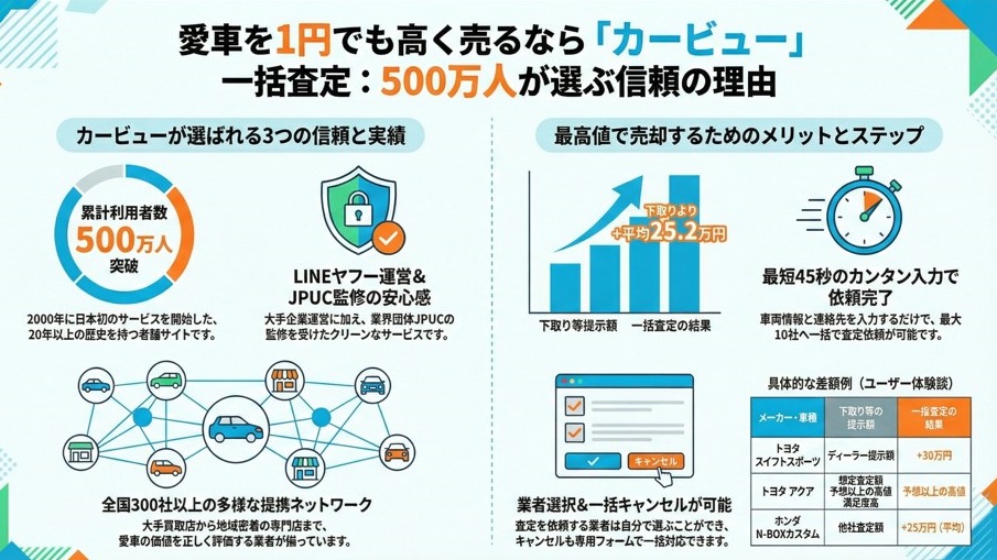 日本の車買取一括査定サービスの中でも最古参のカービューは、長年かけて積み上げた全国200社以上の提携ネットワークを持ち、大手から地域密着型・専門業者まで幅広い業者が競争に参加します。