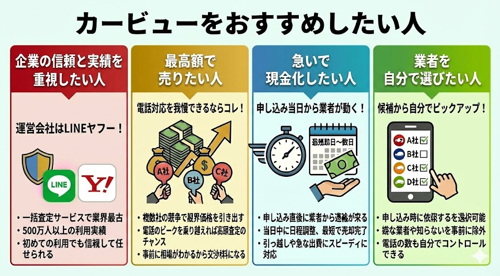 - 電話は対応できる・とにかく高く売りたい → カービュー