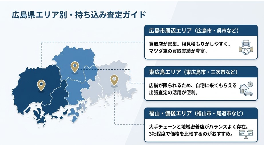 広島県は東西に広く、広島市と福山市の間は約100kmあります。店舗が近くにないエリア(三次市・庄原市・神石高原町など県北部・山間部)にお住まいの方は、出張査定に対応している業者かどうかを申し込み時に確認してください。カーネクストやブローカーは広島県全域への出張査定に対応しています。