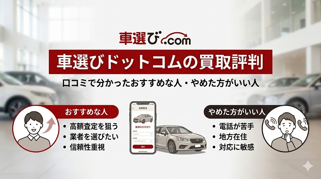 車選びドットコムは使い勝手の良い一括査定サービスですが、すべての人に合うわけではありません。 電話対応そのものが苦痛な人、自分のペースでじっくり比較したい人、価格交渉を一切したくない人には別のサービスの方が満足度が高くなります。
